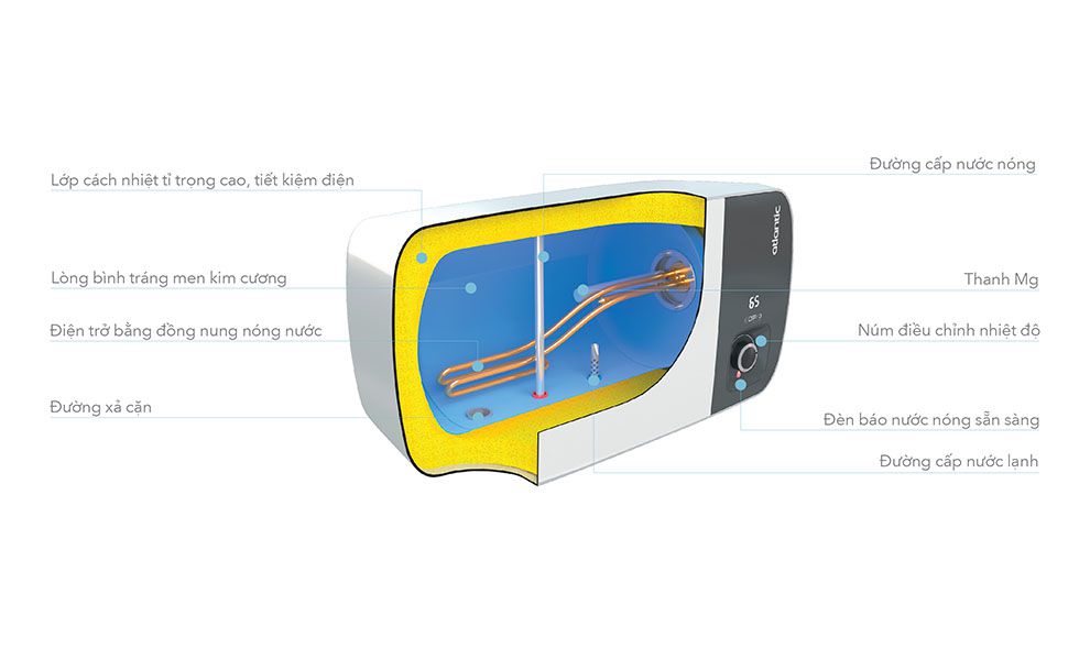 Với Bình Nóng Lạnh Atlantic cấu tạo riêng biệt theo tiêu chuẩn Bình nóng lạnh Điện tiêu chuẩn . Mức dung tích 20 Lít cùng các thành phần Lớp cách nhiệt tiết kiệm điện, Đường cấp nước lạnh, Chế độ ECO, Đường cấp nước nóng, Điện trở bằng đồng, Thanh Mg được lắp ráp thành một sản phẩm hoàn thiện theo phong cách Châu Âu.